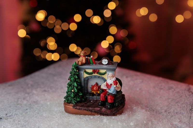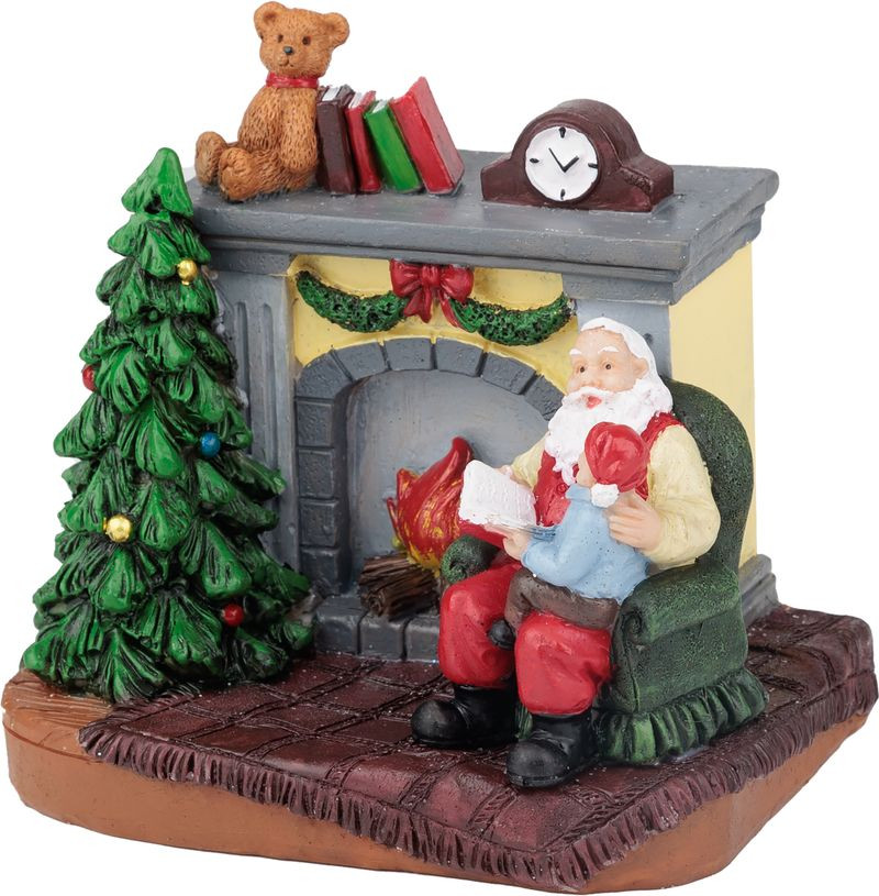 MagicHome karácsonyi dekoráció, Mikulás gyerekkel a kandalló mellett, LED, belső, 10,5x8x9 cm, eladó