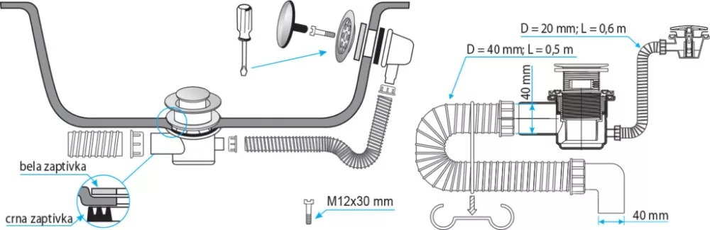 TEXO kádszifon - KRÓM - Klikk - klakk leeresztővel - flexibilis csővel - Ø 5/4" x 0,5 m x Ø 40 mm