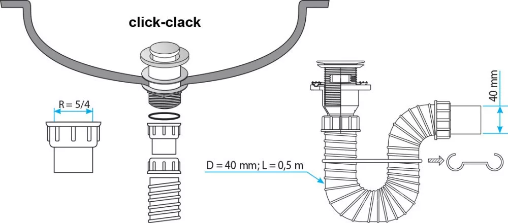 TEXO KLIKK- KLAKK króm sr. mosdószifon flexibilis cső, túlfoly. leeresztő - Ø 5/4" x 0,5 m x Ø 40 mm